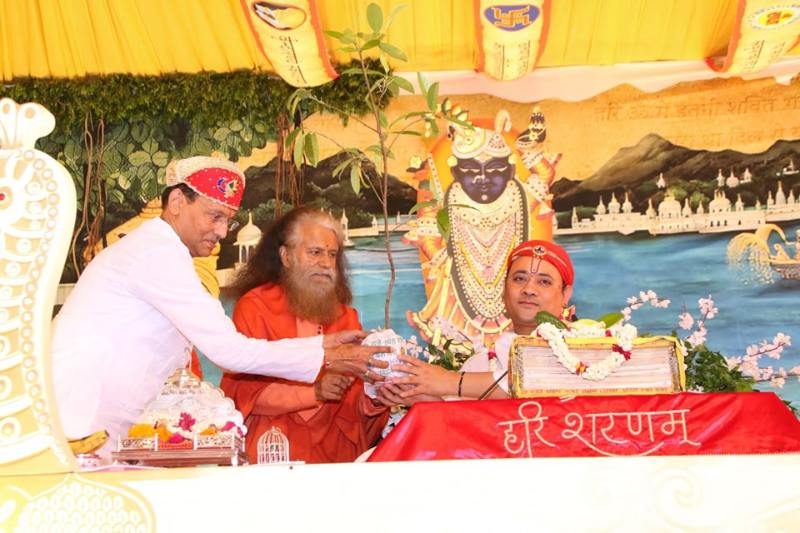 स्वामी चिदानन्द सरस्वती जी ने कथा व्यास श्री राधाकृष्ण जी और बंग परिवार को हिमालय की दिव्य भेंट रुद्राक्ष का पौधा देकर पर्यावरण संरक्षण का संकल्प कराया।