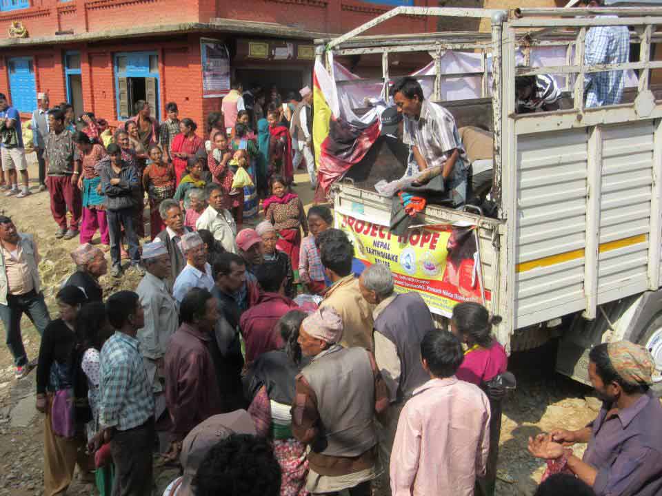 But by your divine blessings, Pujya Swamiji, we suffered only minor injuries and are safe and recovering well. Even after the Earthquake we decided to continue to the village, arriving around 3pm, and distributed the much needed blankets, daily supplies and other things for nearly 700 families. There was huge crowd gathered to collect the relief material and they were so, so happy to receive the things we provided.