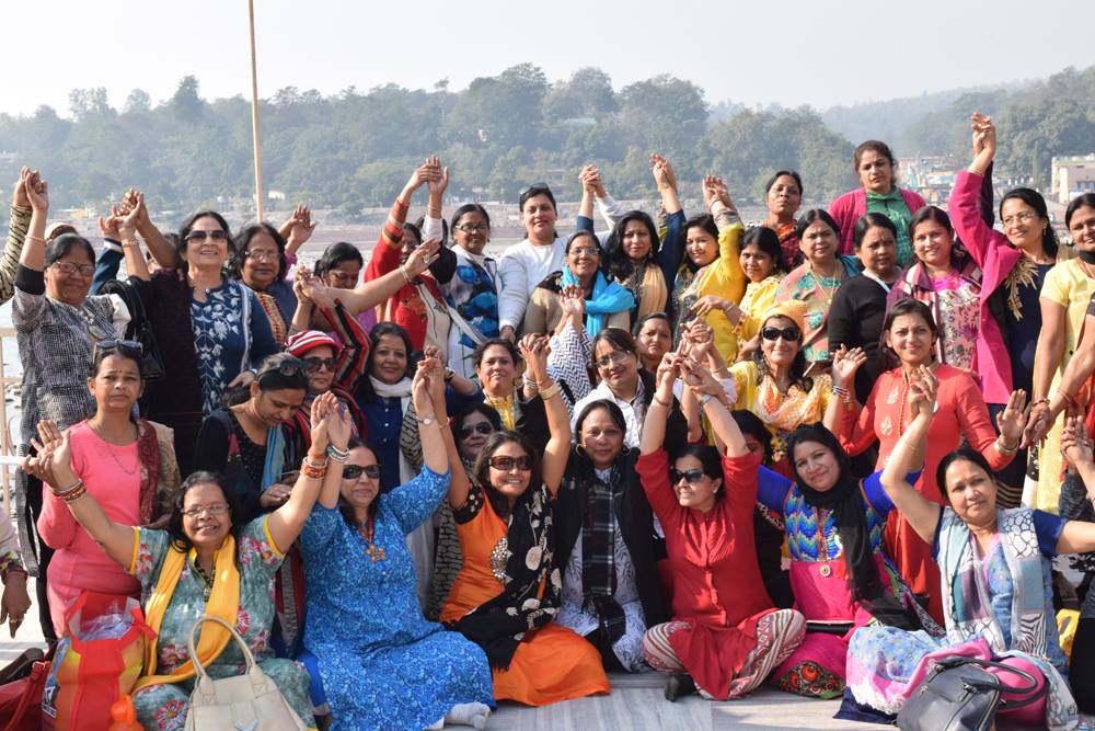 Secretary- General Akhil Bhartiya Marwari Mahila Sammelan’s Smt Sushma Agarwalji, brought home to Parmarth Niketan (Rishikesh) a 80 women delegation from the states of Bihar, West Bengal, Orissa, Maharashtra, Chattisgarh and Delhi. On their three day tour of Uttarakhand they spent one evening participating in the divine Ganga Aarti.