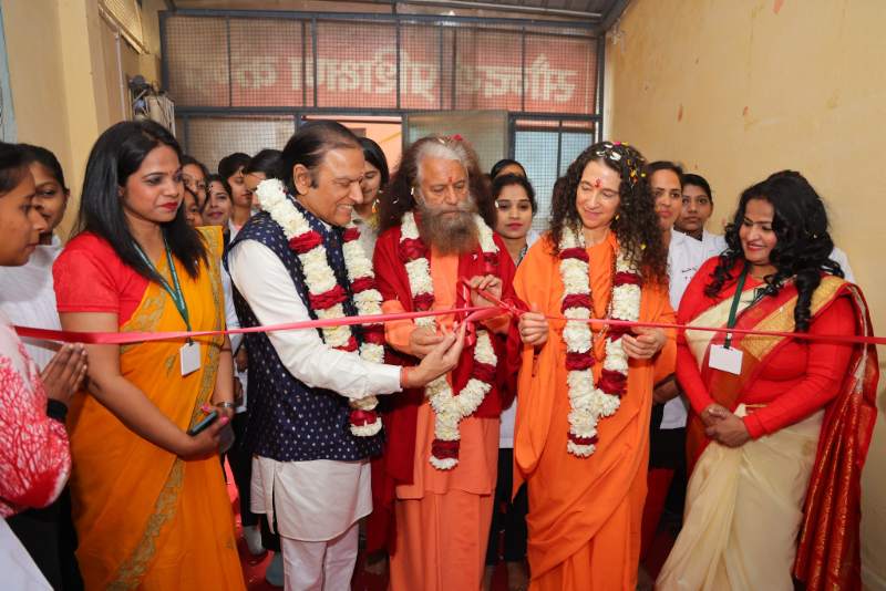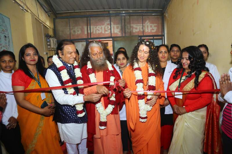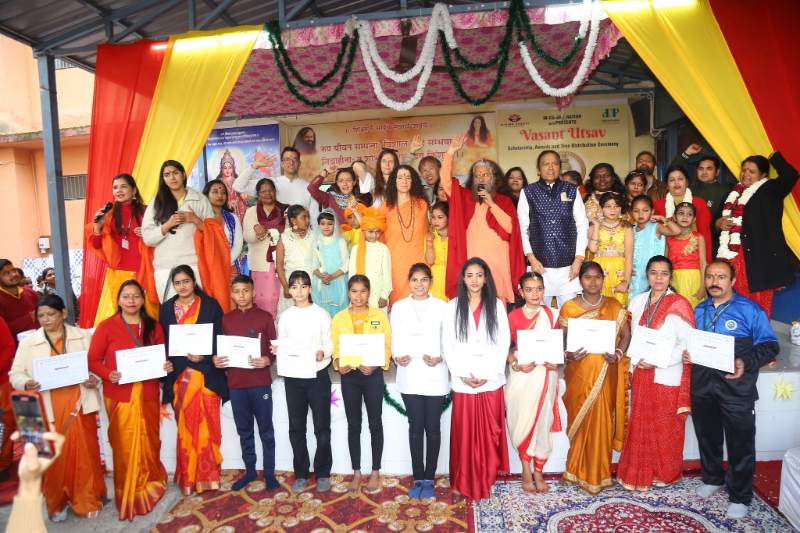 On the festive occasion of Basant Panchami, the day we celebrate the coming of Spring and the Goddess of Wisdom Ma Saraswati, Pujya Sadhviji, Pujya Swamiji, Shri Dr. Dinesh Shahraji, many other guests and visitors from around the world, and the seva team from Parmarth Niketan and Divine Shakti Foundation gathered for a special celebration at Parmarth Vidya Mandir, one of Divine Shakti Foundation’s free schools and women’s empowerment centers. The vibrant celebration included songs and dance, prayers and puja and a display of the beautiful clothing, embroidery and accessory work being done by the girls and women in the vocational training programmes.
