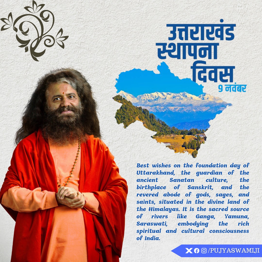 Best wishes on the foundation day of Uttarakhand, the guardian of the ancient Sanatan culture, the birthplace of Sanskrit, and the revered abode of gods, sages, and saints, situated in the divine land of the Himalayas. It is the sacred source of rivers like Ganga, Yamuna, Saraswati, embodying the rich spiritual and cultural consciousness of India.