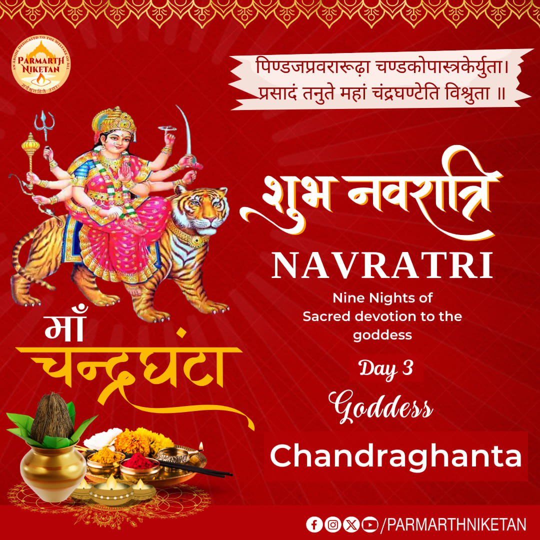 Parmarth Niketan extends heartfelt wishes on the third day of Navratri dedicated to Maa Chandraghanta. May her divine presence surround you, filling your being with courage, wisdom, and strength. May her grace light your way, guiding you through life’s trials with grace and resilience. Embrace her blessings and find comfort in her eternal love.