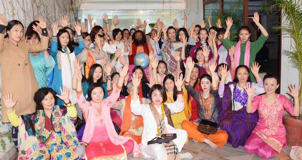 Mohan Bhandari and Yan Yin, Co-founders of Yogi Yoga, the most famous and leading yoga center in China, arrived with their delegation of thirty to forty yogis and students to seek Pujya Swami Chidanand Saraswatiji – Muniji’s blessings on the auspicious occasion of the Chinese New Year. They took part in a special Havan and Ganga Aarti on the eve of the Chinese New Year and received a special Rudraksha sapling as a symbol of Pujya Swamiji’s green blessings. He inspired them with His words of deep appreciation for bringing the art and science of Yoga to China. He also blessed them to continue to bring the tree of Yoga and the light of Yoga into the lives and hearts of countless many. Thereafter they joined Him for a special water blessing ceremony and pledged to not just DO Yoga but to truly BE Yoga, living a greener lifestyle by consciously reducing their carbon and water footprint. On the morning of the Chinese New Year, the group enjoyed a special satsang with Pujya Swamiji, in which they were inspired by His simple yet profound message, “New Year, New Dream, Be Green.”