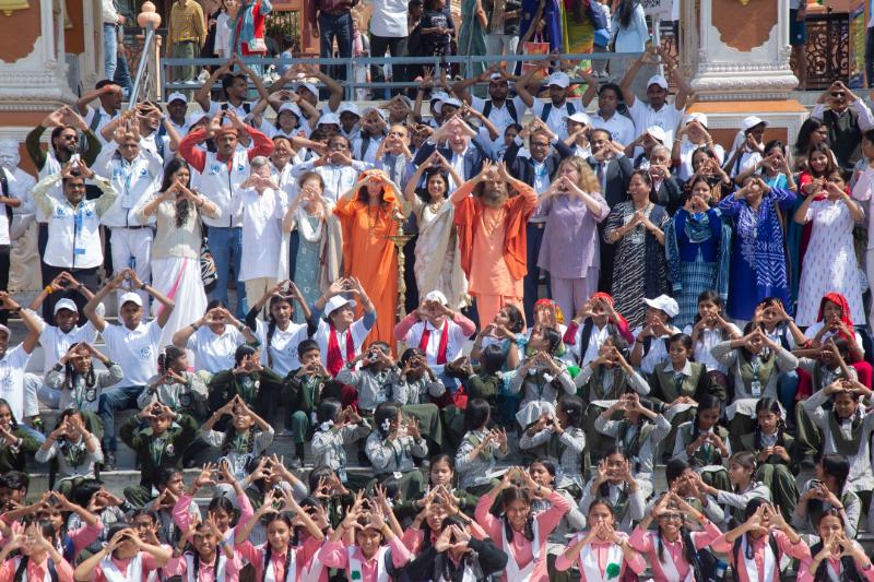 The day concluded with a symbolic rally to the Ganga Ghat and a special World Renowned Ganga Aarti with ‘Water for Peace’ messages in the evening, connecting another more than 1000 pilgrims in person and more online, as the sunset.