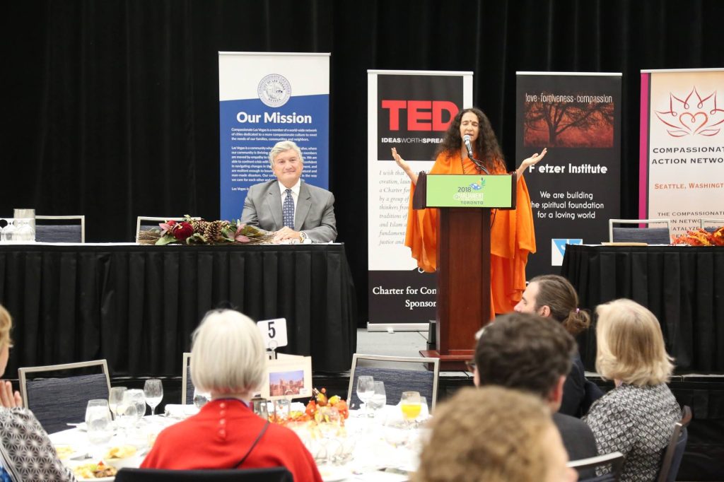 During a large vegan banquet entitled Celebrating Compassion with the theme “Let your Passion for Compassion be your Compass” at the Parliament of the World’s Religions, organized by the Charter for Compassion. Karen Armstrong, Founder of the Charter for Compassion, best selling world famous author and expert on religion, was the keynote speaker.