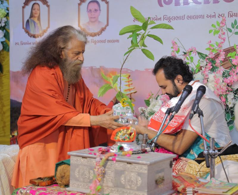 рд╕реНрд╡рд╛рдореА рдЬреА рдиреЗ рдХрдерд╛ рд╡реНрдпрд╛рд╕ рд╢реНрд░реА рдпрдЧреНрдиреЗрд╢ рднрд╛рдИ рдУрдЭрд╛ рдЬреА рдФрд░ рднрд▓рд╛рд▓рд╛ рдпрдЬрдорд╛рди рдкрд░рд┐рд╡рд╛рд░ рдХреЛ рдЖрд╢реАрд░реНрд╡рд╛рдж рд╕реНрд╡рд░реВрдк рд░реВрджреНрд░рд╛рдХреНрд╖ рдХрд╛ рдкреМрдзрд╛ рднреЗрдВрдЯ рдХрд┐рдпрд╛ред рд╕рднреА рдиреЗ рдЗрд╕ рджрд┐рд╡реНрдп рд╡рд╛рддрд╛рд╡рд░рдг рдореЗрдВ рдХрдерд╛ рд╢реНрд░рд╡рдг рдХрд░рдиреЗ рдХрд╛ рдЕрд╡рд╕рд░ рдкреНрд░рджрд╛рди рдХрд░рдиреЗ рд╣реЗрддреБ рд╕реНрд╡рд╛рдореА рдЬреА рдХреЗ рдкреНрд░рддрд┐ рдХреГрддрдЬреНрдЮрддрд╛ рд╡реНрдпрдХреНрдд рдХреАред