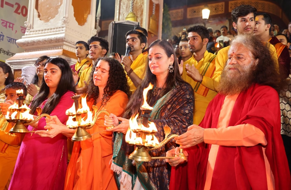 स्वामी जी ने गंगा जी की आरती के माध्यम से हरित पर्व मनाने का संकल्प कराया। साथ ही अभिनेत्री दीया मिर्जा को रूद्राक्ष का दिव्य पौधा आशीर्वाद स्वरूप भेंट किया।