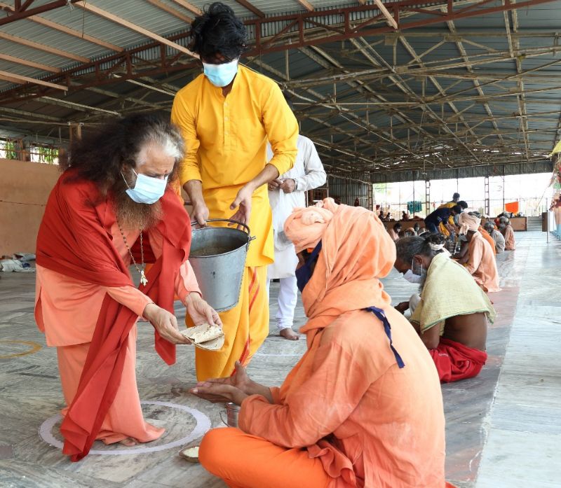 Each day since the current lockdown started, Parmarth Niketan has been providing food for the saints and monks and the needy and destitute on the holy banks of Mother Ganga. On World Family Day, that food was served with great love by the President of Parmarth, HH Pujya Swami Chidanand Saraswatiji, and the SDM for Yemkeshwar, Shri Manish Kumar Singhji, themselves.