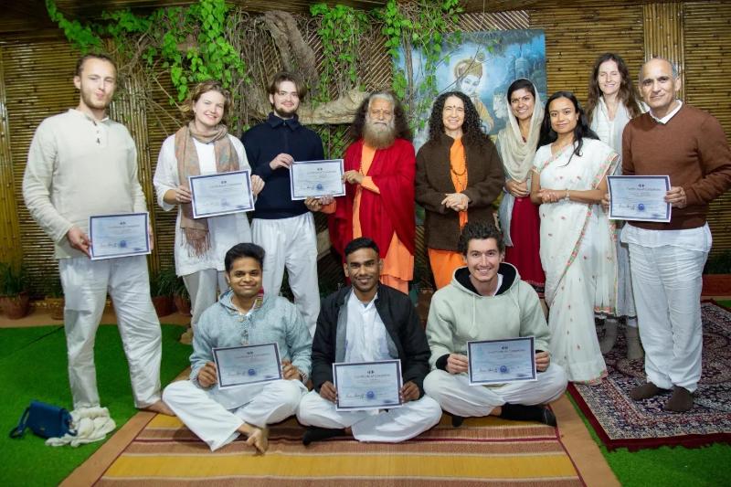 The Foundation Course in Yoga at Parmarth Niketan in Rishikesh concluded on 11th Dec. Participants from various countries received certificates and Rudraksh plants from HH Param Pujya Swami Chidanand Saraswatiji, all receiving divine blessings.