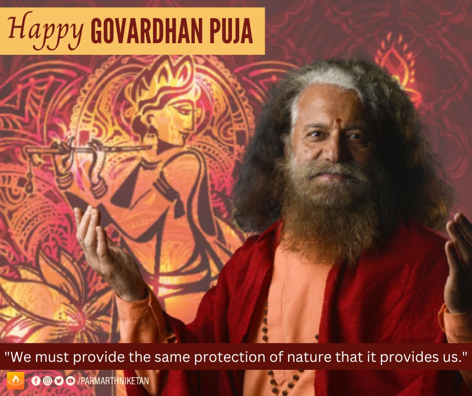 “When Lord Indra sent torrential rains to punish the people of Goverdhan for not worshipping Him,” HH Param Pujya Swami Chidanand Saraswatiji shares on this sacred day of Govardhan Puja, “it was Lord Krishna and Mother Nature that protected them. This divine act shows us how God protects all devotees who take singular refuge in him.