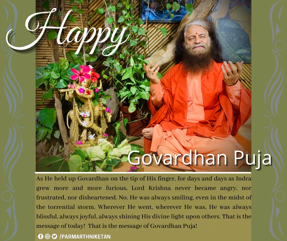“The people of Govardhan worshipped Lord Indra,” HH Pujya Swami Chidanand Saraswatiji shares on this sacred day of Govardhan Puja. “However, Bhagwan Krishna admonished them and said that they should worship Govardhan instead, since it was Govardhan who gave them land, water, and grass for their cows. Yet, the people were afraid. Indra threatened to wreak havoc upon their lives if they ceased his worship. As Indra pummeled the beautiful land of Govardhan with rain, hail, thunder and lightening, Lord Krishna held up the mountain of Govardhan over the heads of the people, protecting them from the violent storm. And, as He held up this mountain on the tip of His finger, for days and days as Indra grew more and more furious, He never became angry, nor frustrated, nor disheartened. No. He was always smiling, even in the midst of the torrential storm.