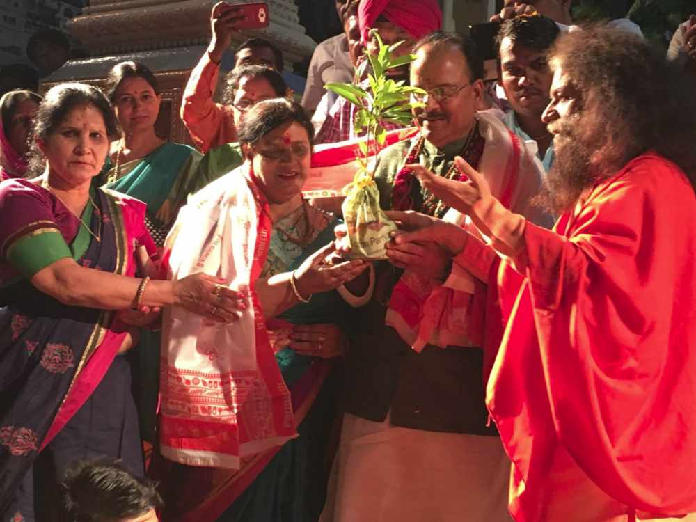 Pujya Swamiji warmly wished Mr and Mrs Bhattji with a sacred Rudraksha plant and a Jai Gange! shawl as a symbol of His blessings and love. They also took part in a special water blessing ceremony to pledge their commitment towards working to protect and preserve the sacred land of Uttarakhand for the welfare of all.