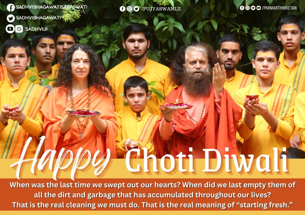 “We must clean out our hearts,” declares HH Param Pujya Swami Chidanand Saraswatiji on the auspicious occasion of Choti Diwali. “We must rid them of darkness and bitterness; we must make them clean and sparkling places for God to live. We must be as thorough with ourselves as we are with our homes. Are there any dark corners in our hearts we have avoided for so long? Are we simply ‘sweeping all the dirt under the rug?’ God sees all and knows all. He knows what is behind every wall of our hearts, what is swept into every corner, and what is hidden under every rug.
