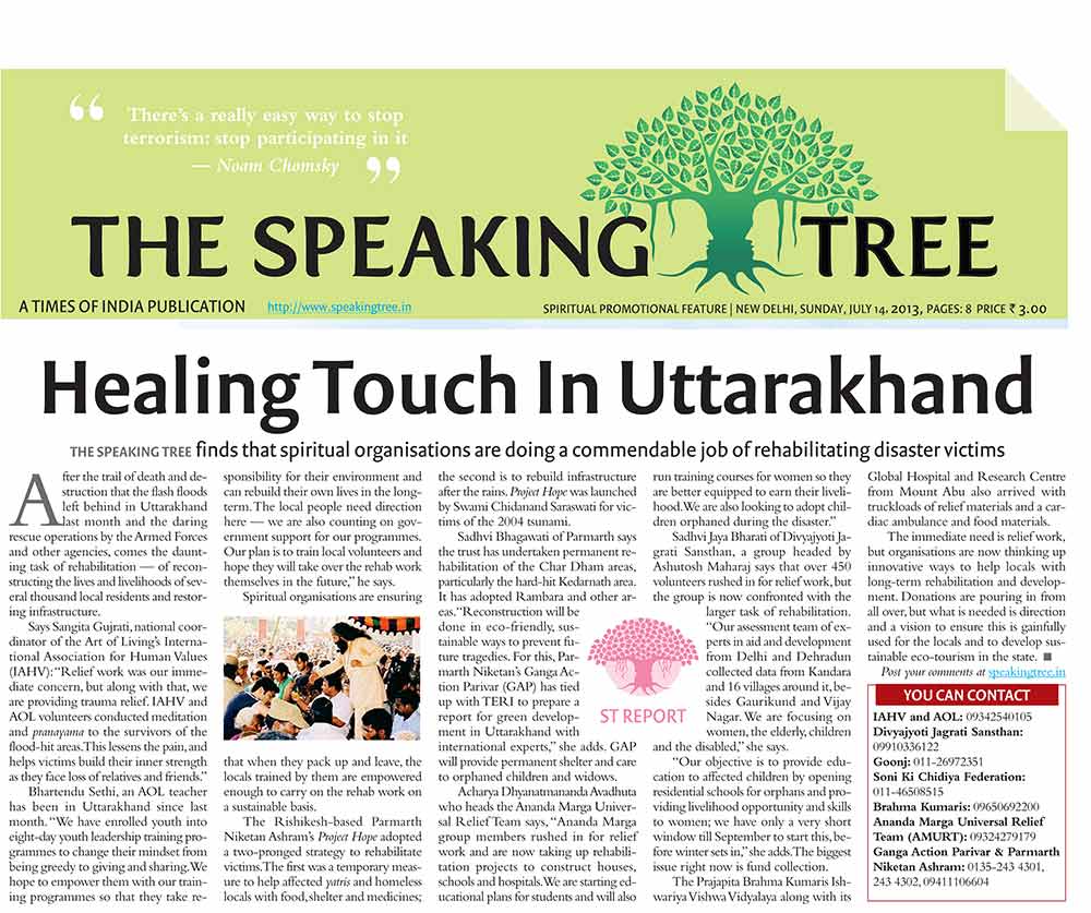 “Healing Touch in Uttarakhand”, The Speaking Tree – Parmarth Niketan