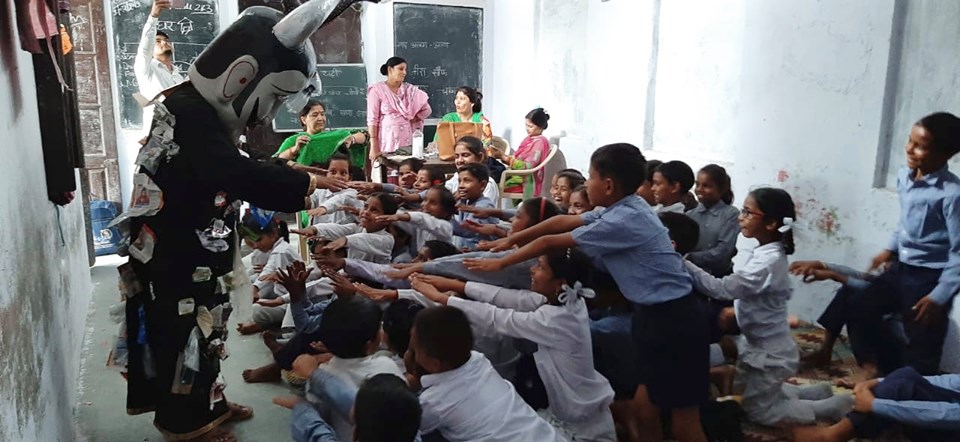 At the end of the lesson, during a fun and playful interaction, our innovative Trash Monster pays a surprise visit, asking the children to show him their hands and finger nails, to see whether they have been washing their hands and implementing the WaterSchools teachings into their lives. The Trash Monster declares in his formidable voice that those who are dirty, cause disease and reck havoc are his friends and those who maintain health, hygiene and harmony are his foes. The children playfully push the Trash Monster away, saying, “We are clean” and “No disease can touch us!”
