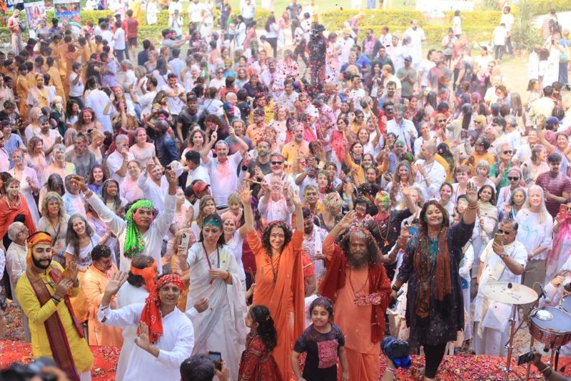A special, eco-friendly, green, YOGIC Holi was celebrated today after an incredible and eco-friendly with cow dungs Holika Dahan celebrations yesterday night with great enthusiasm and joy by the participants of the annual world famous International Yoga Festival who got a very special experience of India’s famous festival of colours filled with messages, dance, songs and inspiring messages on the significance of these Festivals.