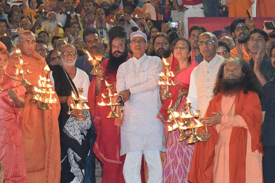 Honb’le Chief Minister Shri Shivraj Singh Chouhanji, with the inspiration of Pujya Swami Chidanand Saraswatiji, with the blessings and in the divine presence of Junapeethadheswar Acharya Mahamandleshwar Swami Avdheshanand Giri Ji Maharaj, renowned Ram Charit Manas exponent Pujya Morari bapu Akhada Committee’s Secretary Pujya Swami Hari Giriji Maharaj, Pujya Swami Harichetanandji Maharaj, Pujya Mahamandleshwar Sadhvi Naisargika Giriji and Pujya Raghumuniji Maharaj inaugurated the Maha Kshipra Aarti.