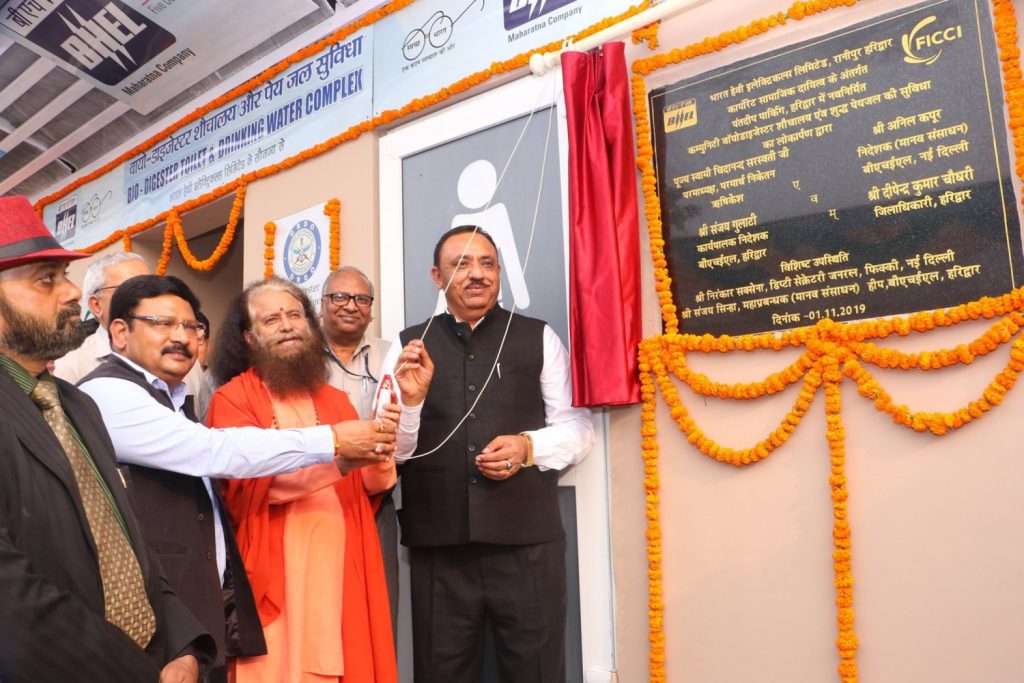 HARIDWAR: HH Pujya Swami Chidanand Saraswatiji, Co-Founder of The Global Interfaith WASH Alliance, Founder Ganga Action Parivar and President of Parmarth Niketan, graced and blessed the official inauguration ceremony of two new eco-friendly, public bio-digester toilet clusters just completed at Pantdweep Parking, Haridwar. He was welcomed by Shri Anil Kapoorji, Director (HR), BHEL, Shri Deependra Kumar Chaudhary, District Magistrate of Haridwar, Shri Sanjay Gulati, GM(I), BHEL Haridwar, Shri Nirankar Saxenaji, Dy Secretary General, FICCI and many others.
