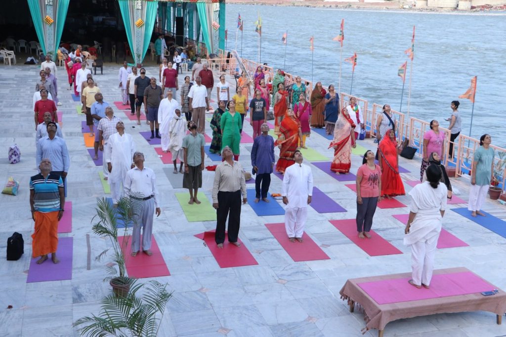 Every Day is International Yoga Day at Parmarth Niketan (Rishikesh) as participants of our month long Shri Ram Katha by Pujya Sant Murlidharji Maharaj along with other pilgrims and tourists enjoy free and open Yoga classes on the banks of Maa Ganga, in the lap of the Himalayas. In the spirit of “Yoga for all and by all,” with the inspiration and blessings of HH Pujya Swami Chidanand Saraswatiji, in service of the visionary leadership of our Hon’ble Prime Minister Shri Narendra Modiji, instructor and Sevikya Ganga Nandini leads a beautiful Sahaj Yoga morning session with everyone.