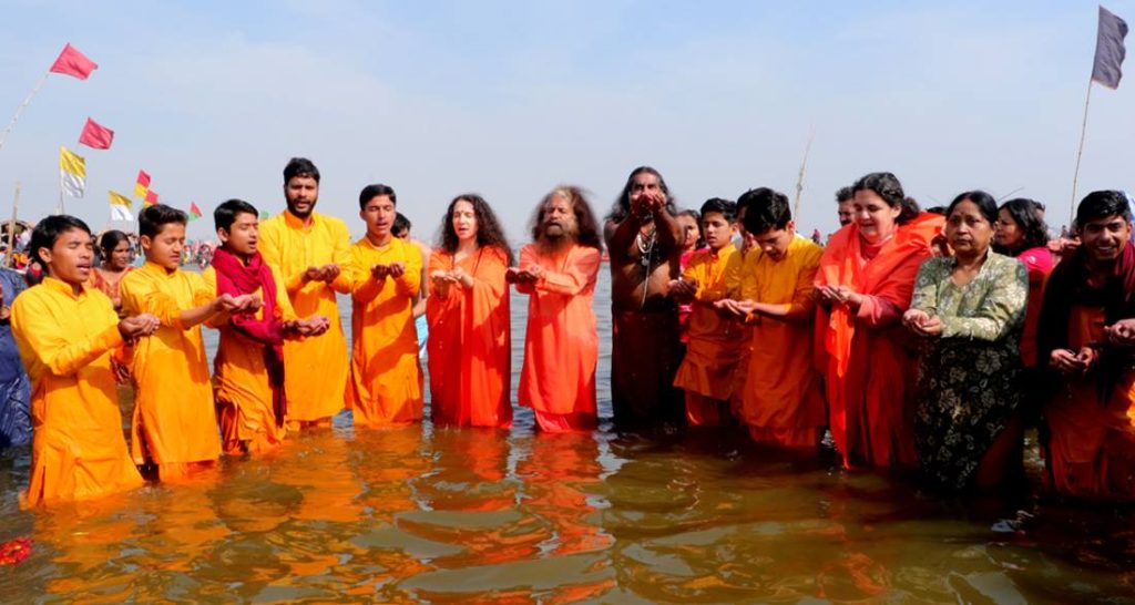 Today on the auspicious day of Makar Sankranti, the day the sun returns to the northern hemisphere, pilgrims from more than twelve countries came together under the leadership of Pujya Swami Chidanand Saraswatiji, President Parmarth Niketan, Rishikesh and Founder, Ganga Action Parivar and Global Interfaith WASH Alliance to have a sacred bath in the sangam of Prayag Raj, Kumbh Mela also to pledge to preserve and protect our Mother Nature and Mother Earth.