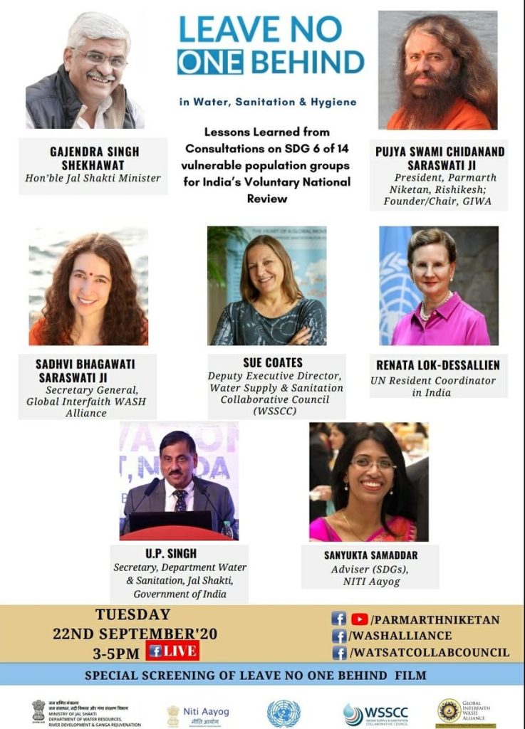 22 September 2020: A historic webinar was held today at the time of the United Nations General Assembly highlighting the success of the Leave No One Behind program in India, particularly around Water, Sanitation and Hygiene. The webinar was organized specifically to share lessons learned during High Level Consultations, organised in December at Parmarth Niketan, Rishikesh, by Global Interfaith WASH Alliance and Water Supply Sanitation Collaborative Council (WSSCC) in association with the Ministry of Jal Shakti, Government of India, United Nations in India, Niti Aayog, and others regarding the achievement of SDG6 (water, sanitation and hygiene) for 14 vulnerable and marginalized population groups during India’s Voluntary National Review.