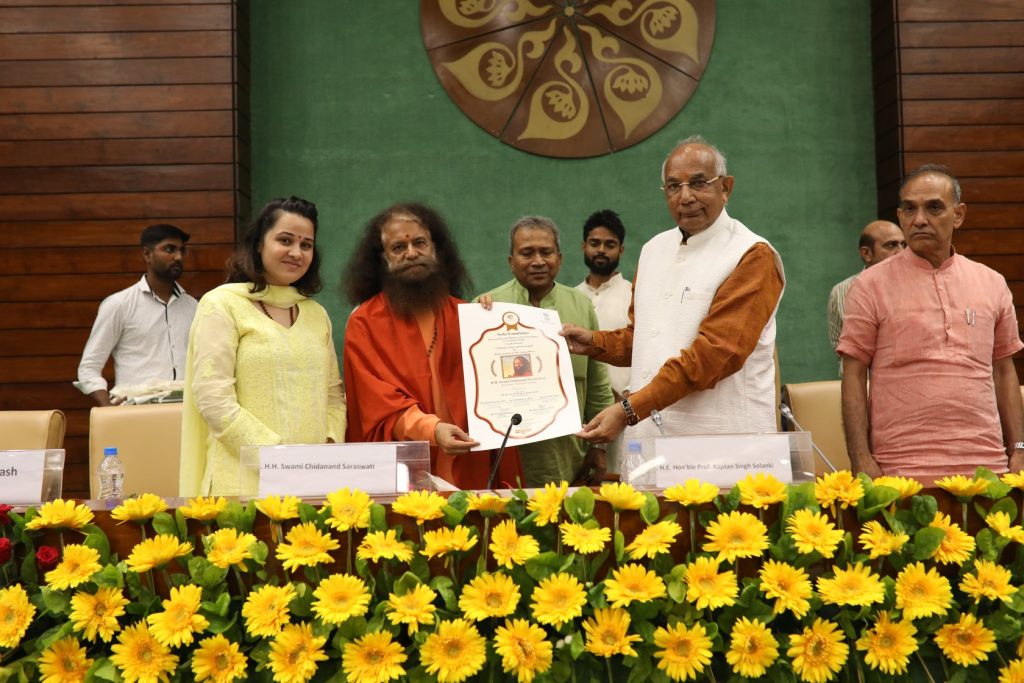 Shri Dal Singh Malhaji who had come to the banks of Maa Ganga and was so deeply touched by HH Pujya Swami Chidanand Saraswatiji’s work and divine leadership that he requested and insisted Pujya Swamiji to grace the Parliament and accept their Lifetime Achievement Award for His incredible service to the nation. Sadhvi Bhagawati Saraswatiji who was supposed to be reaching back from the USA at the beginning of this month was also asked to grace and bless the auspicious occasion. Pujya Swamiji graciously consented and the event took place with of HE Governor of Haryana Prof. Kaptan Singh Solankiiji, Honble Union Minister of State, HRD and Ganga Rejuvenation Dr. Satyapal Singhji, Shri Dnyaneshwar Mulayji, Secretary, MEA. The event included a beautiful book launch of Shri Dal Singh Malhaji’s “Sansad Meri Karma Bhumi” which shared his lifetime of service to the Parliament of India.