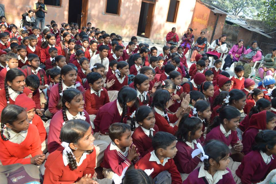 As people around the world celebrate Valentine’s Day this week with gifts of chocolate and roses, as symbols of their love and devotion, it is the perfect time, as Pujya Swamiji reminds us, year after year, to renew our commitment to our Mother Ganga and Mother Nature, which provide unconditionally to all. Children all over the world will make Valentine’s Day cards for their mothers. Pujya Swamiji inspires us that here in India, every day, not only February 14, should be an opportunity to show love and devotion to our Divine Mother. With His inspiration and green vision in mind, Sadhvi Bhagawatiji visited one of Divine Shakti Foundation’s school projects with volunteers from a large, month long Kundalini Yoga Teacher’s Training Course taking place at Parmarth Niketan to celebrate Valentine’s Day with over 200 school children.