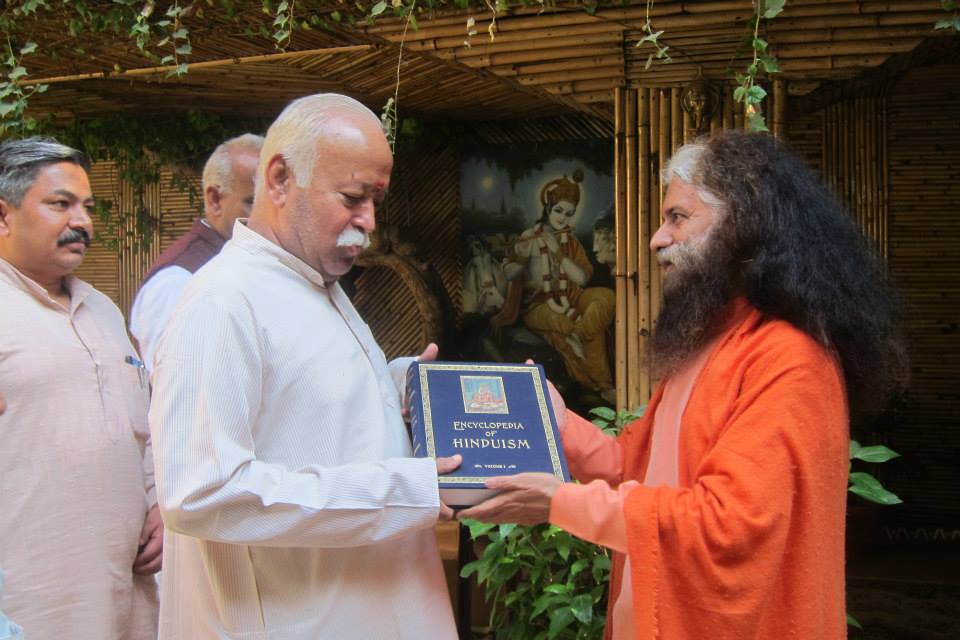 Amongst the various other topics of their conversation for cleaning and greening the nation, Pujya Swamiji also presented Mananiya Bhagwatji with an official and full copy of the International Edition of the Encyclopedia of Hinduism, a project led, inspired and conceived by Pujya Swamiji with the tenacious dedication and remarkable leadership of Sadhvi Bhagawatiji, Managing Editor of the gorgeous eleven volume Encyclopedia. Mananiya Bhagwatji had graciously accepted just last month Pujya Swamiji’s invitation to launch the International Edition of the Encyclopedia with the Hon’ble Vice President of India along with many other revered interfaith leaders and eminent dignitaries in a historic event at the Vigyan Bhawan.