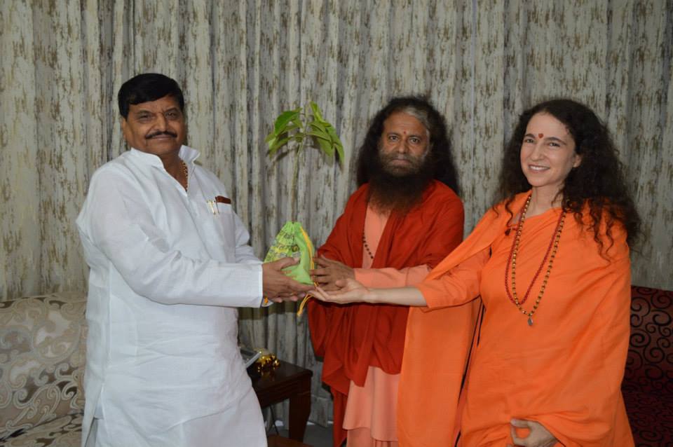 Pujya Swami Chidanand Saraswati Ji and Sadhvi Bhagawati Saraswati Ji met with the Honourable State Minister of Irrigation, Uttar Pradesh, Shri Shivpal Singh YadavJi to discuss the progress of the Clean and Green River Gomti project. The Hon’ble Minister previously met with and was inspired by Pujya Swamiji’s commitment during the Allahabad Kumbha Mela in 2013. After Hon’ble Yadavji’s snan (holy dip) in the sacred Sangam (confluence of Ganga, Yamuna and Saraswati) he vowed to create a green model and example on the banks of the River Gomti, one of the major tributaries of the River Ganga. Pujya Swamiji lauded Hon’ble Yadavji’s great dedication, commitment and action to this pledge and the great progress being made under his leadership.