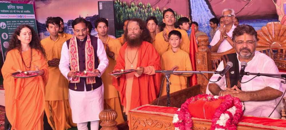 The former Chief Minister of Uttarakhand, current Member of Parliament Dr.Ramesh Pokhriyal Nishank ji was welcomed by Pujya Swami Chidanand Saraswatiji – Muniji and Sadhvi Bhagawati Saraswati during his visit to Parmarth Niketan to attend the divine Shri Ram Katha. They joined together to honour Pujya Kathakar Acharya Murlidharji with a sacred Rudraksha sapling and also asked all the devotees to take a pledge to save the #environment and water plus to plant more trees to save mother earth.