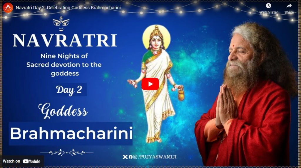 Blessings from HH Pujya Swami Chidanand Saraswatiji Maharaj on this special 2nd day of Navratri, dedicated to Goddess Brahmacharini. This form symbolizes Moksha, Peace, and Prosperity, represented by the pure color white. Pujya Swamiji emphasized Goddess Parvati’s unwavering faith and love for Bhagawan Shiva. He highlighted the significance and power of a pledge or intention, showing how it can shape our world. Even in the face of lust, envy, and greed, even in darkness, we can choose the path of God. By doing so, we are guided from darkness to light, remaining grounded and anchored in the divine light.