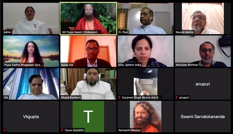 Yesterday Pujya Swami Chidanand Saraswatiji and Sadhvi Bhagawati Saraswatiji participated in two online events. Firstly, an online meeting of Interfaith Leaders organised by Sphere India and UNICEF, and secondly a Live Global Prayer event with India’s greatest Yogacharyas, organised by the Indian Yoga Association.