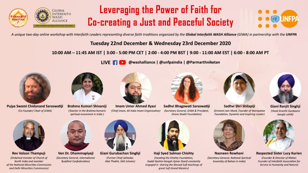 Join us for a unique two-day online workshop entitled “Leveraging the Power of Faith to Co-create a Just and Peaceful World” with eminent Interfaith Leaders representing our diverse faith traditions organized by the Global Interfaith WASH Alliance in partnership with the UNFPA India today.