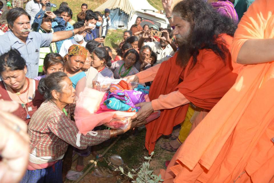 During His visit, Pujya Swamiji personally distributed relief material such as tents, tripals, blankets, solar lanterns, clothes and other necessities to many remote villages in Nepal. Already two large trucks of relief materials have been dispatched from Rishikesh, with over 10,000 blankets, 10,000 water bottles, 50,000 packets of daily supplies, 5,000 tents as well as two trucks of foods supplies have been distributed.