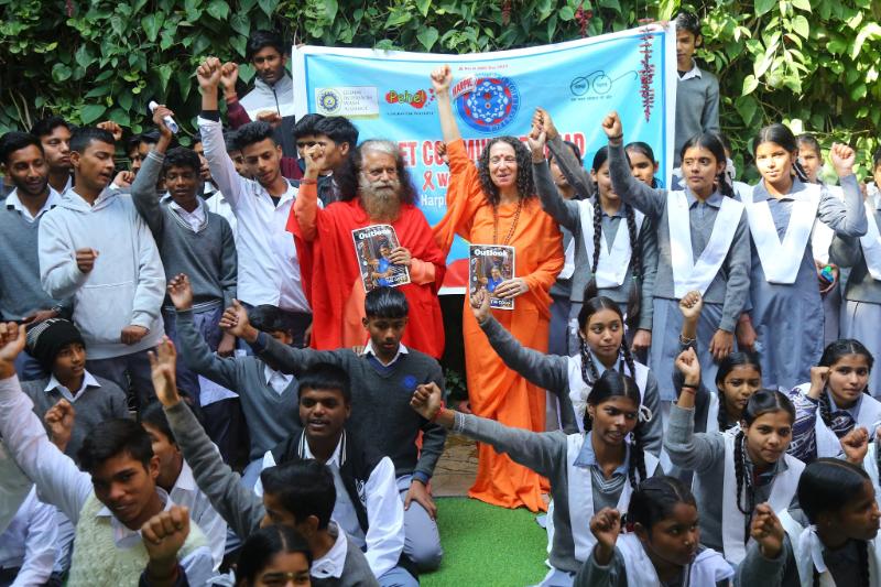 As the world commemorated World AIDS Day and honoured the memory of the millions lost to the disease since it was first discovered over 40 years ago, Pujya Swamiji and Pujya Sadhviji joined students of GGIC Laxman Jhula and the Parmarth Niketan family for a rally and counseling session organized by Parmarth Niketan, Global Interfaith WASH Alliance, Harpic World Toilet College, and the Jagran Initiative to raise public awareness about AIDS and to allay the fears and misconceptions held by the public about the disease – fears and misconceptions that are leading to increases in inequalities in communities throughout India.