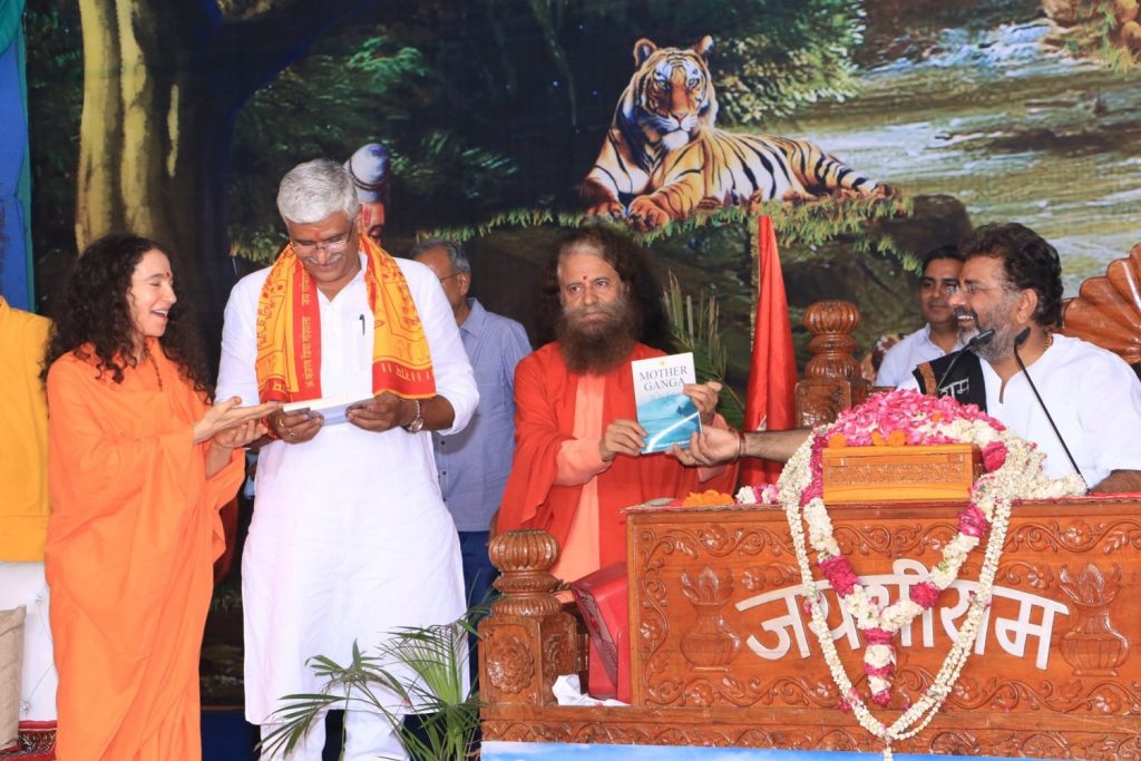 The launch took place during a huge Shri Rama katha celebration and was broadcast live across not only India but more than 100 countries around the world. Joining in the launch were Shri Narendra Kumarji and Shri Ashish Gosain, publishers of Haranand books, New Delhi, the publisher of Call of Ganga, and Pujya Sadhvi Bhagawatiji’s earlier book, From Illness to Wellness. The new book, a compilation of articles that Sadhviji has written during her twenty-three years living in India on the banks of Ganga, was presented to the Honorable Cabinet Minister of Jal Shakti (Water Resources), Shri Gajendra Singh Shekhawatji on the following day, June 13, the auspicious day of Nirjala Ekadashi.