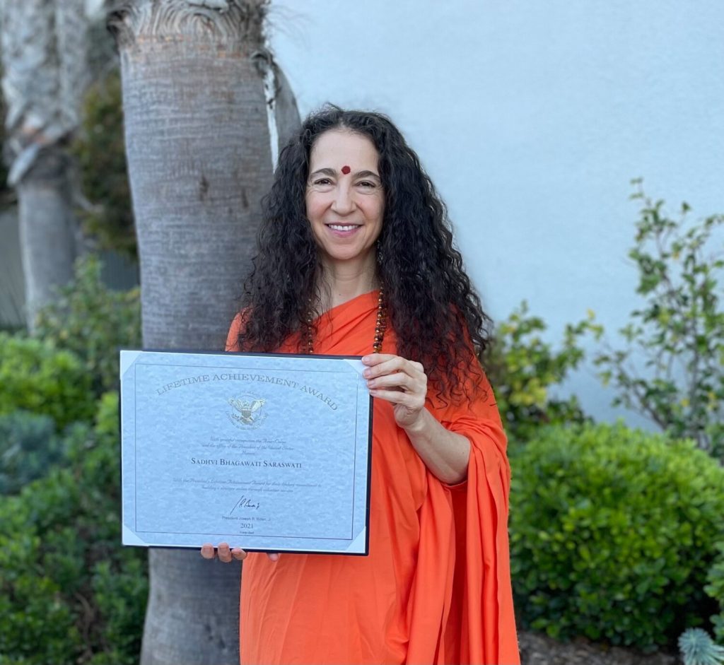 Pujya Sadhvi Bhagawati Saraswatiji , PhD, Secretary-General, Global Interfaith WASH Alliance and President, Divine Shakti Foundation , based at Parmarth Niketan, Rishikesh, was awarded the Lifetime Achievement award from the President of the United States of America for her lifelong commitment to volunteer service. The lifetime achievement awards are given by AmeriCorps and the President of the United States.