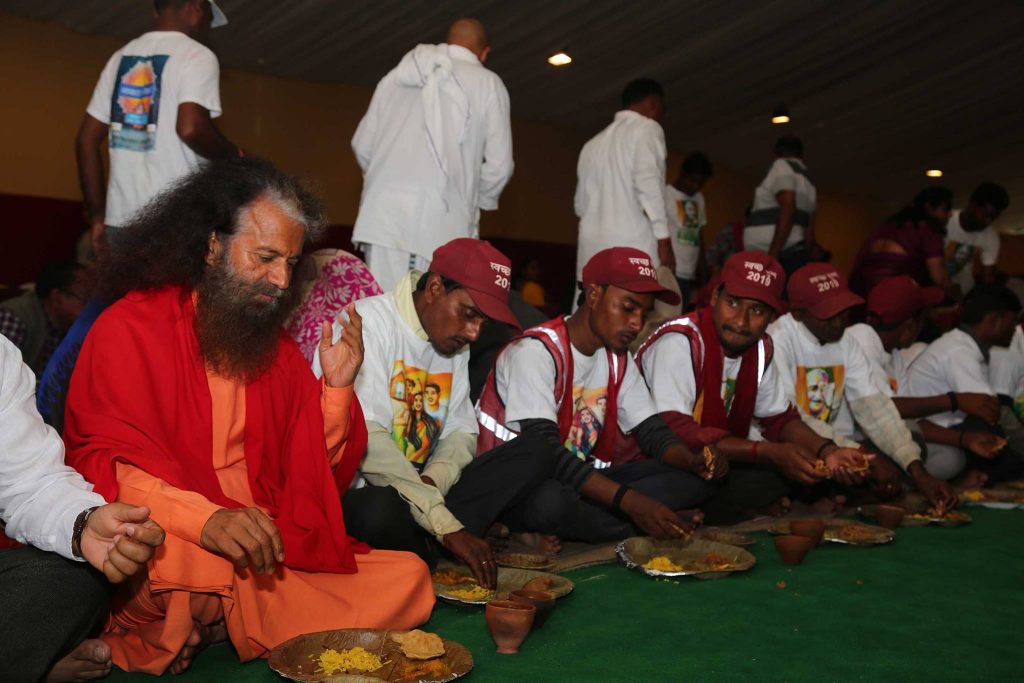 Today at the Parmarth Niketan camp in Kumbh Mela, Pujya Swami Chidanand Saraswatiji led a historic event during which Saints and the sanitation workers who have performed the most noxious tasks at the Kumbh joined hands and hearts in a ceremony that honored the sweepers. Then the saints, rishikumars and guests at the Parmarth camp fed the sweepers in a large feast and then sat down to join them for a celebratory meal or bhandara.