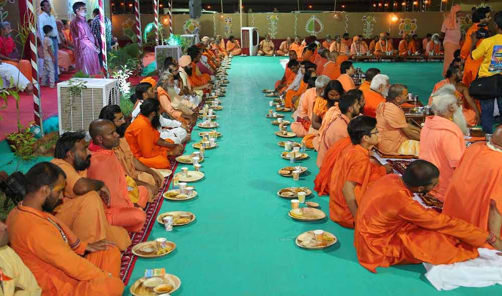 A very, very special and grand bhandara was organized by Parmarth Niketan, in association with the Maha Nirvani Akhara, at the gorgeous Parmarth camp, which was especially decorated to welcome the revered saints, during Simhasth Kumbh Mahaparv – 2016. The feast of the saints brought together more then 70 of the most eminent Mahamandeleshwars from all lineages as well as more than 1,500 sadhus and saints.