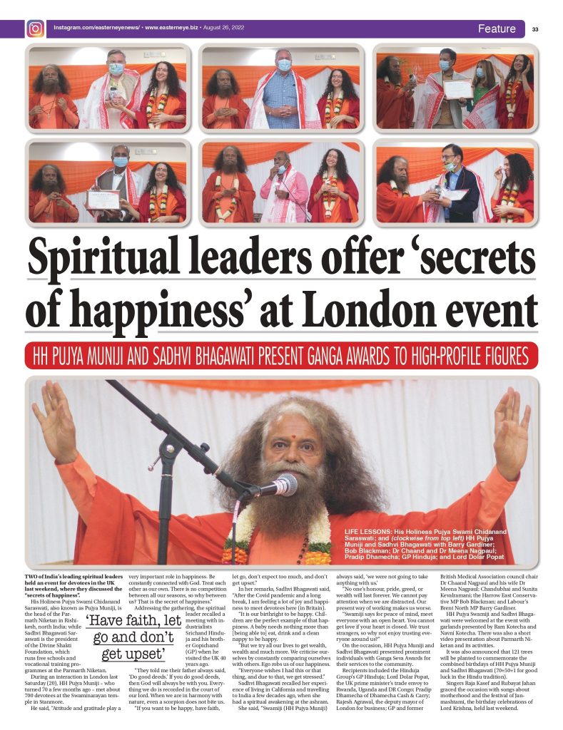 We all want to be happy and, in a beautiful evening hosted by the UK diaspora in London recently, HH Param Pujya Swami Chidanand Saraswatiji and Pujya Sadhvi Bhagawati Saraswati ji shared the simple and effective way that we can unlock the secrets of happiness in our own lives. Britain’s number one Asian weekly newspaper, Eastern Eye, was on-hand for the event, and provided the in-depth and colourful coverage that they are noted for!