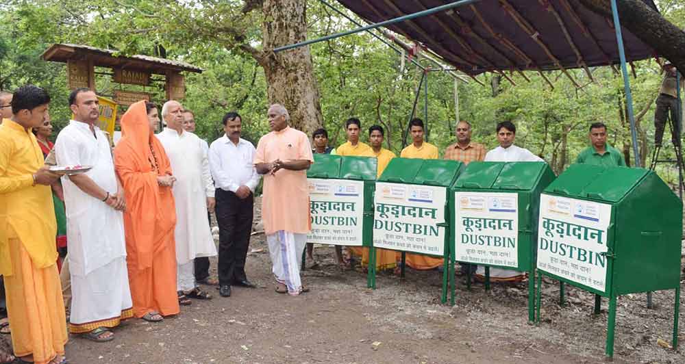 Each dustbin had especially been designed to have separate compartments for organic and inorganic waste and made animal proof so that monkeys and other stray animals would not tamper with the trash, especially as much of the route that they were being placed along was the eco-sensitive Rajaji National Park route. They had been painted green to look attractive and printed with messages of Swachta Kranti to inspire the Kanwar Yatris to support the Swachh Bharat Mission, India (Clean India Mission). The district administration was also roped into ensure the emptying and proper disposal of the waste every day throughout the mela. In addition to this, messages and signage was placed along the route to remind yatris to keep the region clean and green.