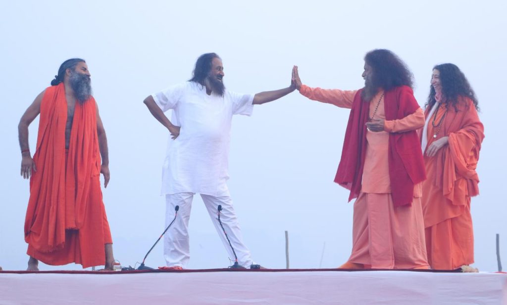 PRAYAGRAJ KUMBH: Pujya Gurudev Sri Sri Ravi Shankarji, Founder, Art of Living, was warmly welcomed this morning at the Yog Kumbh by Pujya Yogrishi Swami Ramdevji and Pujya Swami Chidanand Saraswatiji and many other revered saints.