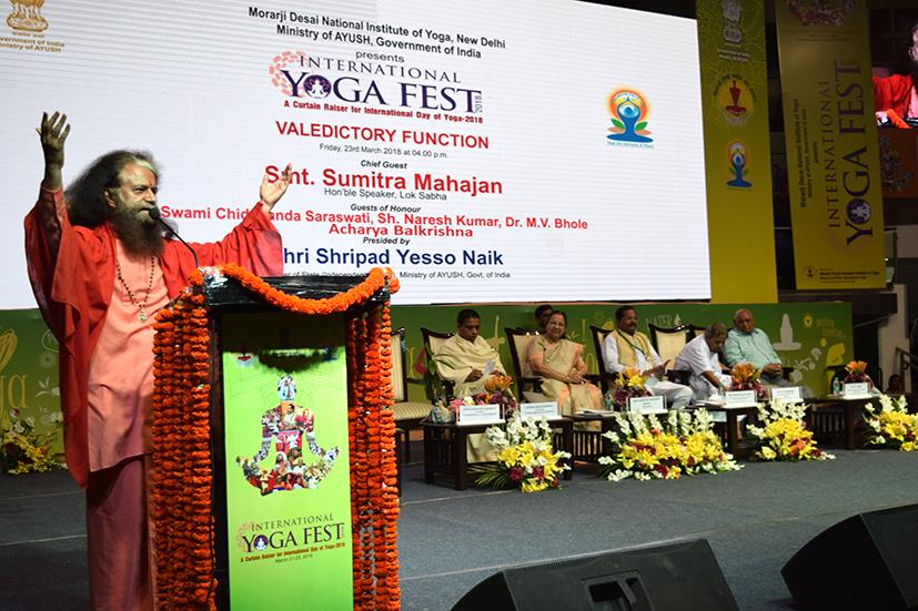 The valedictory session of the three day International Yoga Festival, organised by the Morarji Desai National Institute of Yoga with the support of the Ministry of AYUSH, Government of India, was graced by Hon’ble Speaker of Lok Sabha Speaker Smt Sumitra Mahajan, Pujya Swami Chidanand Saraswatiji – Muniji, Pujya Acharya Bal Krishnaji, Dr H R Nagendraji, Chancellor SVASYA, Dr MV Bhole, researcher & Yoga Scholar, Lonavala, Pune and Sh.Naresh Kumar, NDMC chairman and many other eminent yoga experts and yoga institutions at the Talkatora Stadium, New Delhi recently.
