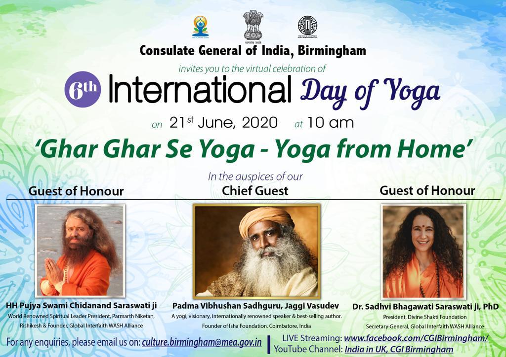 Find the key to Joy & Peace! Join the divine 6th International Yoga Day 2020 LIVE celebrations “Ghar Ghar se Yoga – Yoga from Home” with the Consulate General of India, Birmingham. This online celebration is blessed with the divine words of Padma Bhushan Sadhguru Jaggi Vasudevji, Pujya Swami Chidanand Saraswatiji, and Sadhvi Bhagawati Saraswatiji.