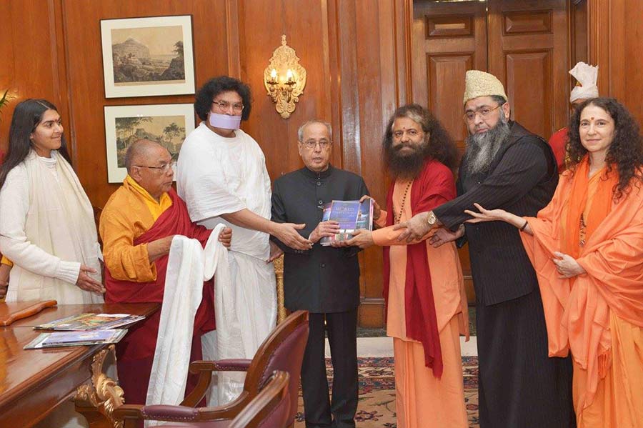 Hon’ble President of India, Shri Pranab Mukherjeeji was presented the Global Interfaith WASH Alliance’s (GIWA) first edition of “WASH in Sikhism” and “WASH in Buddhism” books* recently by GIWA’s Co-Founder Pujya Swamiji, and GIWA’s interfaith leaders and representatives, including: Imam Umer Ahmed Ilyasiiji, President, All India Organization of Imams of Mosques, Venerable Lama Lobzangji, Secretary General, International Buddhist Confederation, President, Asoka Mission, India, Acharya Dr. Lokesh Muniji, President-Founder of the Ahimsa Vishwa Bharti, Sadhvi Bhagawati Saraswatiji, Secretary- General, Global Interfaith WASH Alliance, President, Divine Shakti Foundation, Sardar Paramjit Singh Chandhokji, Chairman of Delhi Sikh Gurudwara Committee, Sardar Kuldeep Singh Bhogalji, National Organising Secretary, Shiromani Akali Dal, Swamini Adityananda Saraswatiji, Director of Programmes, Policy and Development, Global Interfaith WASH Alliance and Ganga Action Parivar, Nandini Tripathi, Director of Programme Implementation.