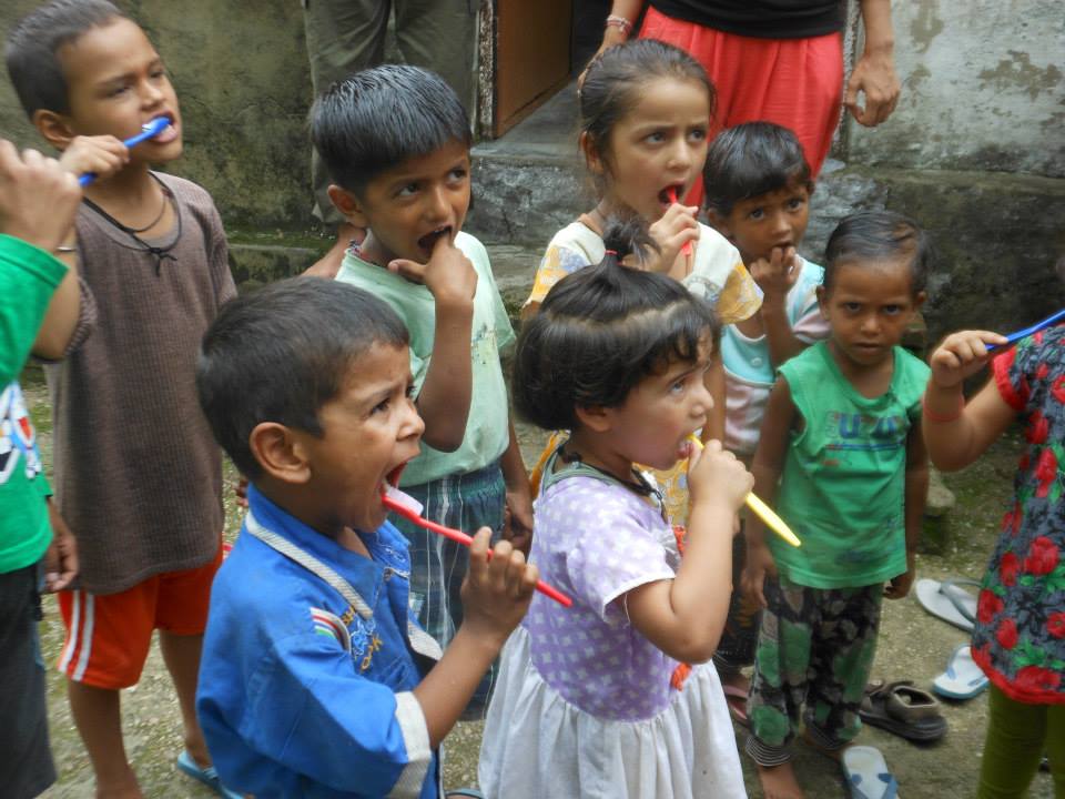 Two of our beautiful volunteers (Swechhya and Allison) emphasized the importance of clean water, sanitation and hygiene to the children and their mothers. They taught them the correct way of brushing their teeth and washing their hands. Jyotiji helped the children trimming their nails. The children were incredibly excited to show off their clean hands and nails.