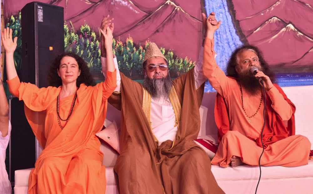 We were so glad to welcome home to the month long Shri Ram Katha the President of All India Imam Organization, Imam Umer Ahmed Ilyasiji yesterday. He joined Pujya Swamiji and Sadhvi Bhagawatiji to bless the devotees and pilgrims partaking in the divine katha. They together honoured Kathakar Murlidharji Maharaj with a sacred Rudraksha sapling as a symbol of his great dedication and commitment to leading the divine Green Katha. A message of oneness, interfaith harmony and call to work together against common evils of pollution, female feoticide, looking a of our elderly parents, preserving our mother tongue, preservation of our environment, conserving the sacred River Ganga and many more social messages were given during their speeches which were being broadcast LIVE through Sanskar TV.