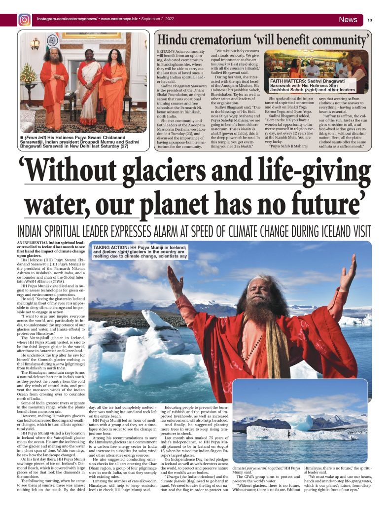 Glad to see Britain’s Number One Asian weekly newspaper, Eastern Eye, provide such essential and timely coverage of HH Param Pujya Swami Chidanand Saraswatiji s’ grave concern over the speed of climate change that He witnessed during His recent visit to Iceland.